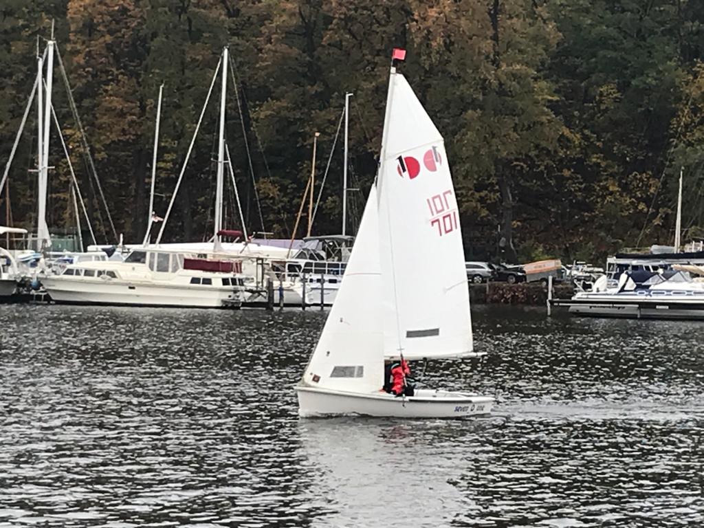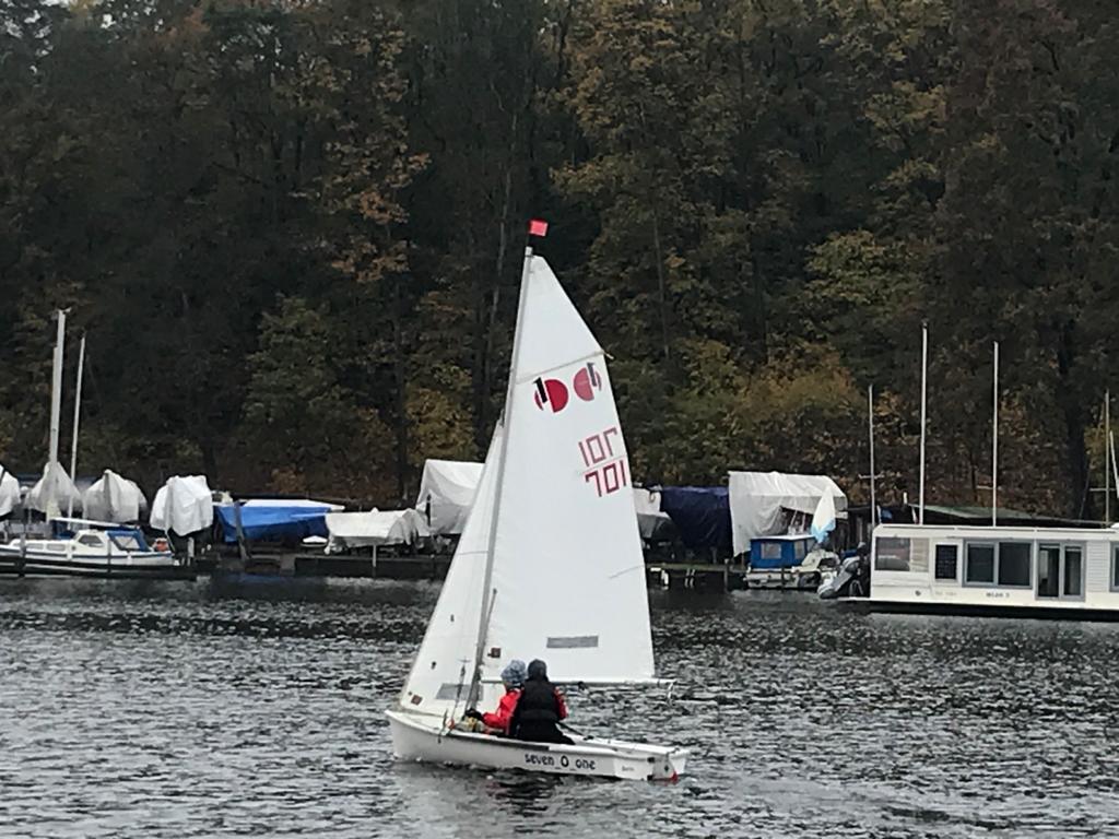 So ab zehn Uhr waren wir dann auf dem Wasser. Es war bewölkt und wir hatten so maximal 2Bft Wind. Mein Steuermann Niko und ich sind die 701 gesegelt. Die Übungsregatten sind wir im Dreieckskurs gesegelt. Wir sind dann immer so ein Dreieck gesegelt, bevor es einen neuen Start gab. Die meiste Zeit haben dabei die Starts gebraucht. Bis auf einmal waren wir immer vorne mit dabei. Wir waren aber auch ab und zu recht früh dran ;-). Da das Feld immer eng zusammen war, kam es zu vielen Vorfahrtssituationen.