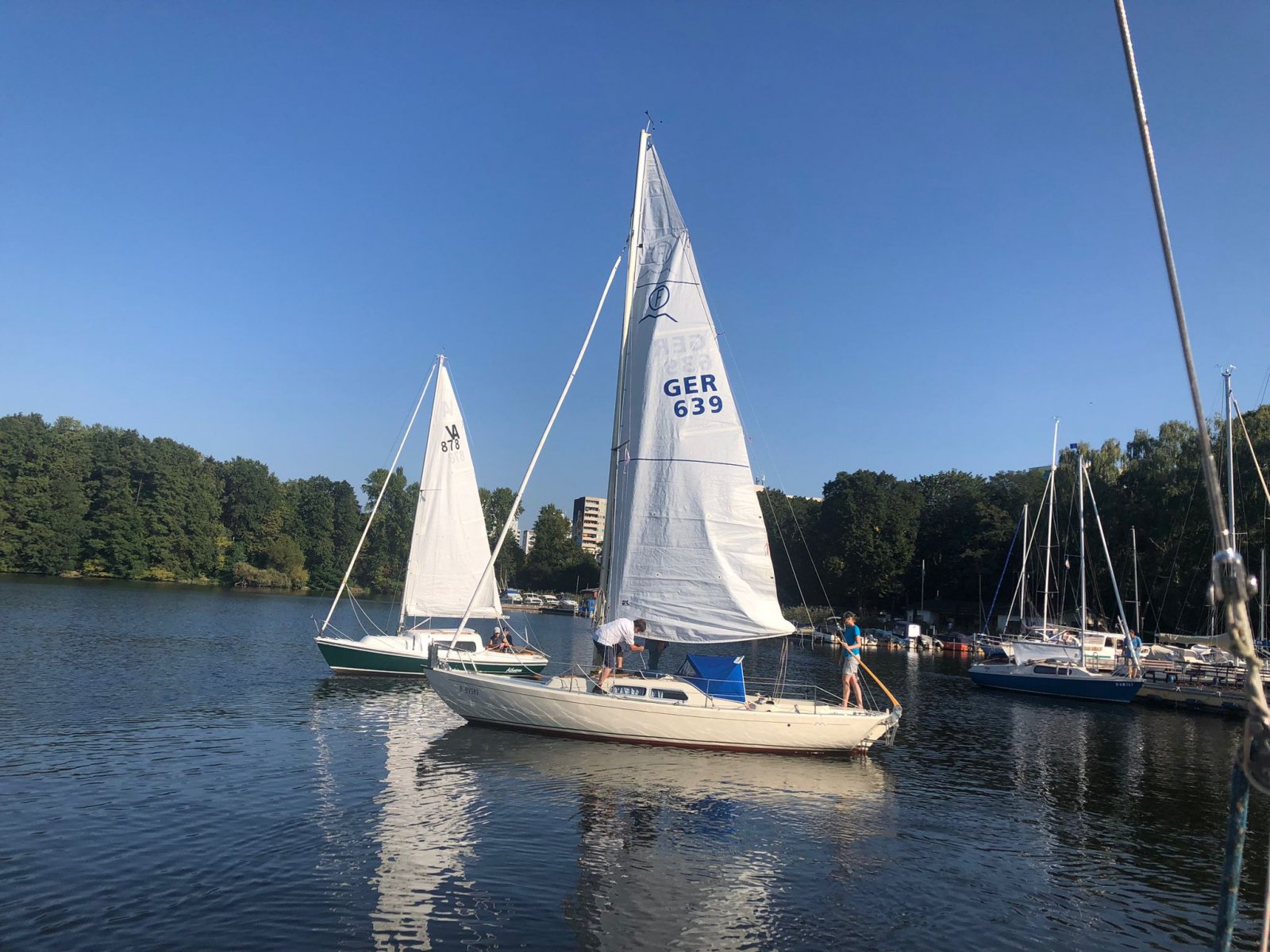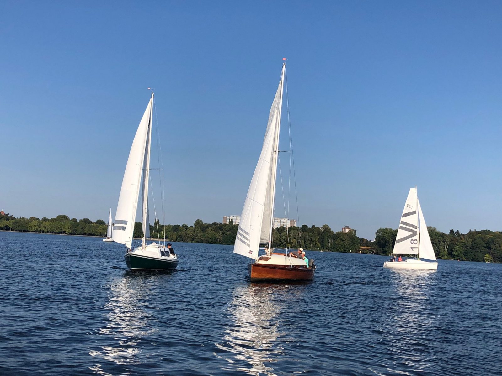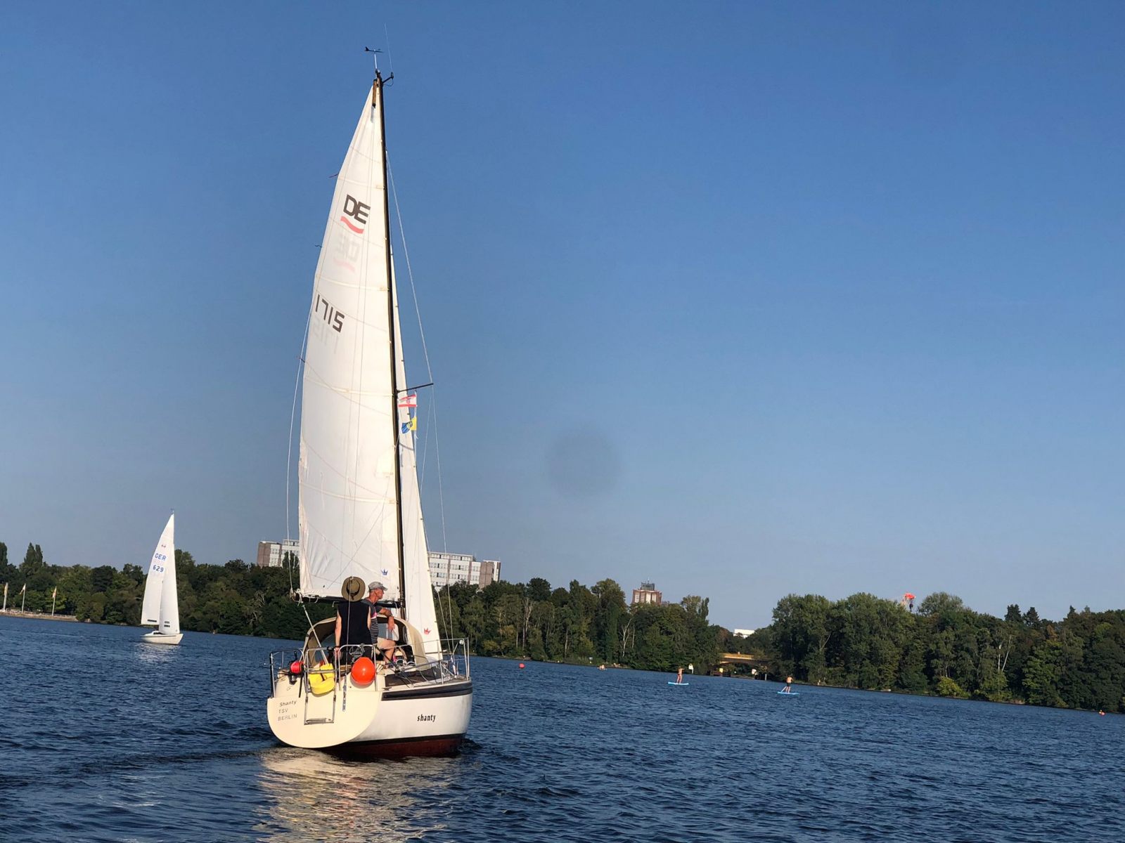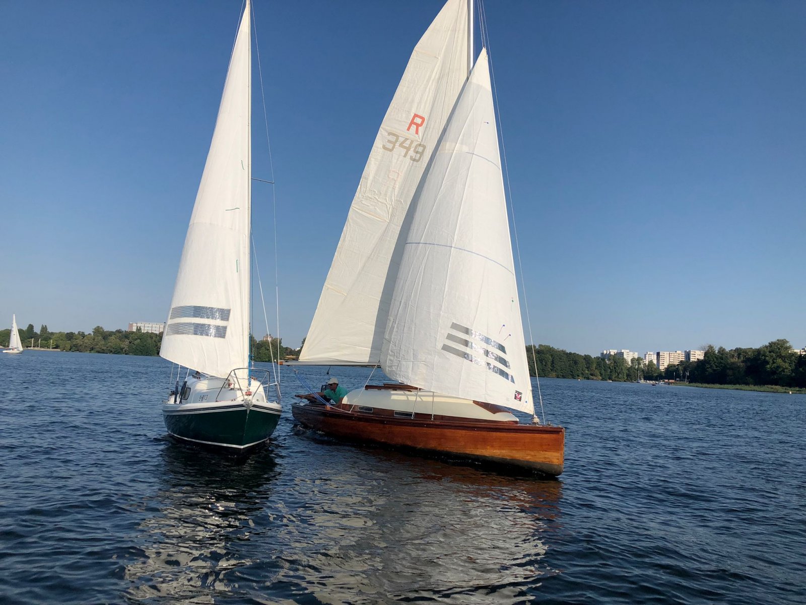Bis kurz vor der Wettfahrt wurden bei sommerlichen 30 Grad schon mal einige erhitzte Gemüter im gut 22 Grad warmen See abgekühlt. In der Zwischenzeit legten Gerald und sein Team den Kurs für den leichten S-SO Wind fest: Start etwa Mitte des Sees, zunächst eine kurze Kreuz Richtung Verein, dann zurück bis kurz vor Lindwerder, von dort wieder Richtung Verein zum Ziel. Vor dem Verein und vor Lindwerder wurden die Wendemarken (=dortige Belüftungstonnen) dazu mit zusätzlichen gelben Markierungen kenntlich gemacht. Rasmus gestaltete den Wind recht variantenreich, und bei der kurzen Strecke war der Start natürlich sehr wichtig. Pünktlich um 17:01 kam das Startsignal für die 11 Boote.Die Nerven lagen in Zweikämpfen mit teils legendärem Potential vielfach blank. Nico und Timo testeten eine völlig neue Taktik: Sie sparten sich den hektischen Start komplett und fuhren erst etwas später in Ruhe los, um kurz darauf überraschend mit ihrer Rennmaschine in Rauschefahrt unter Spi in der Spitzengruppe aufzutauchen. Das Feld war relativ dicht beisammen, und es wurde bis zum letzten Meter um die Positionen gekämpft. Nach etwa 35 Minuten war der Spaß dann leider schon vorbei. An Land erwartete bereits die Crew der Vergnügungskommission die Athleten, und nach einer neuerlichen kommunikativen Erfrischung im See gab es Wraps zum Selberbauen. Bei der Bekanntgabe der Platzierungen lagen erneut die Nerven blank, diesmal gleich doppelt, denn durch ein ausgefuchstes, derzeit noch nicht abschließend zu durchschauendes Verfahren wird erst im Nachhinein festgelegt, welche Platzierung einen Bericht über die Wettfahrt verfassen darf…