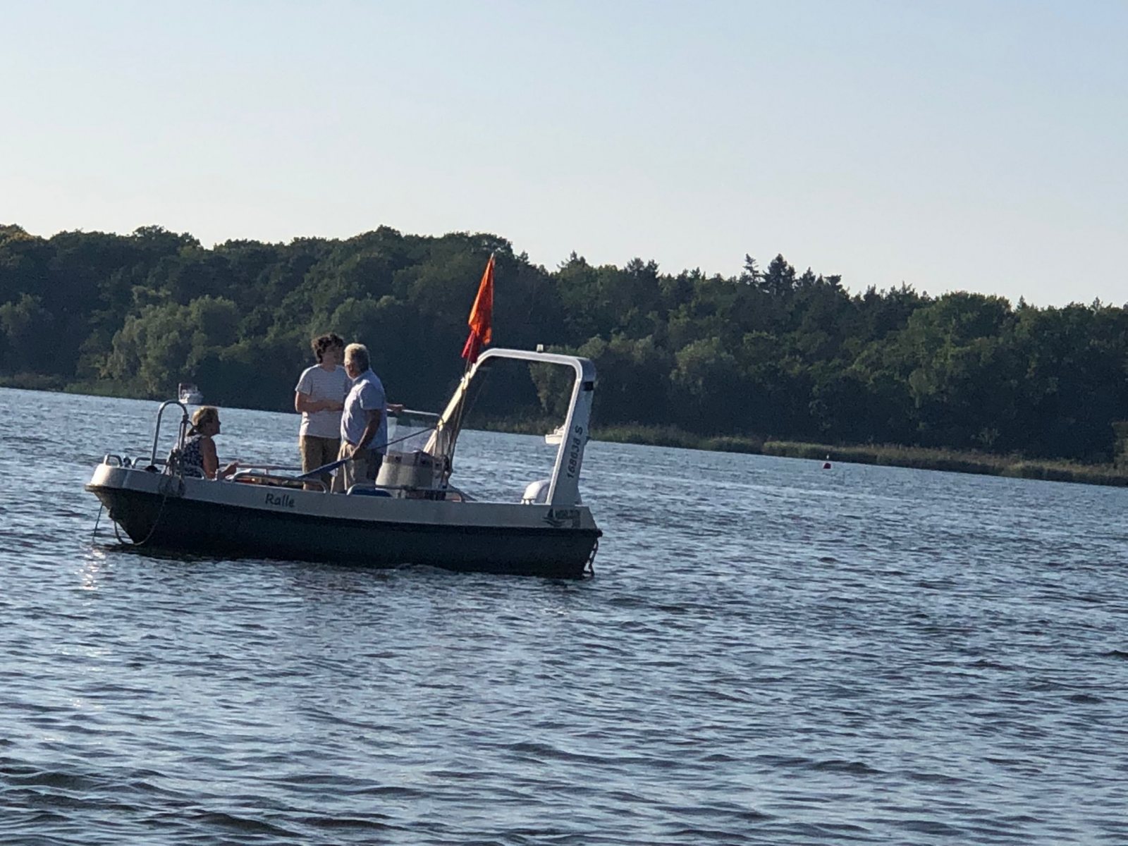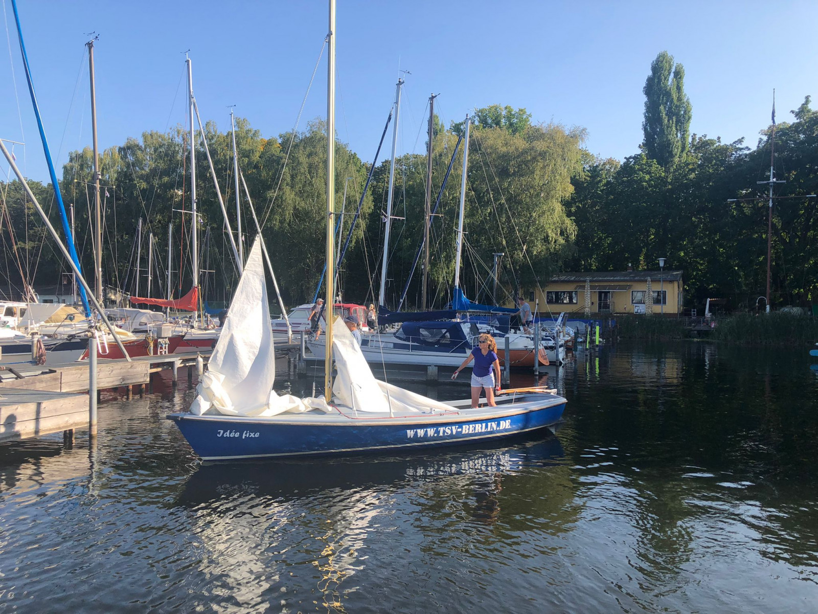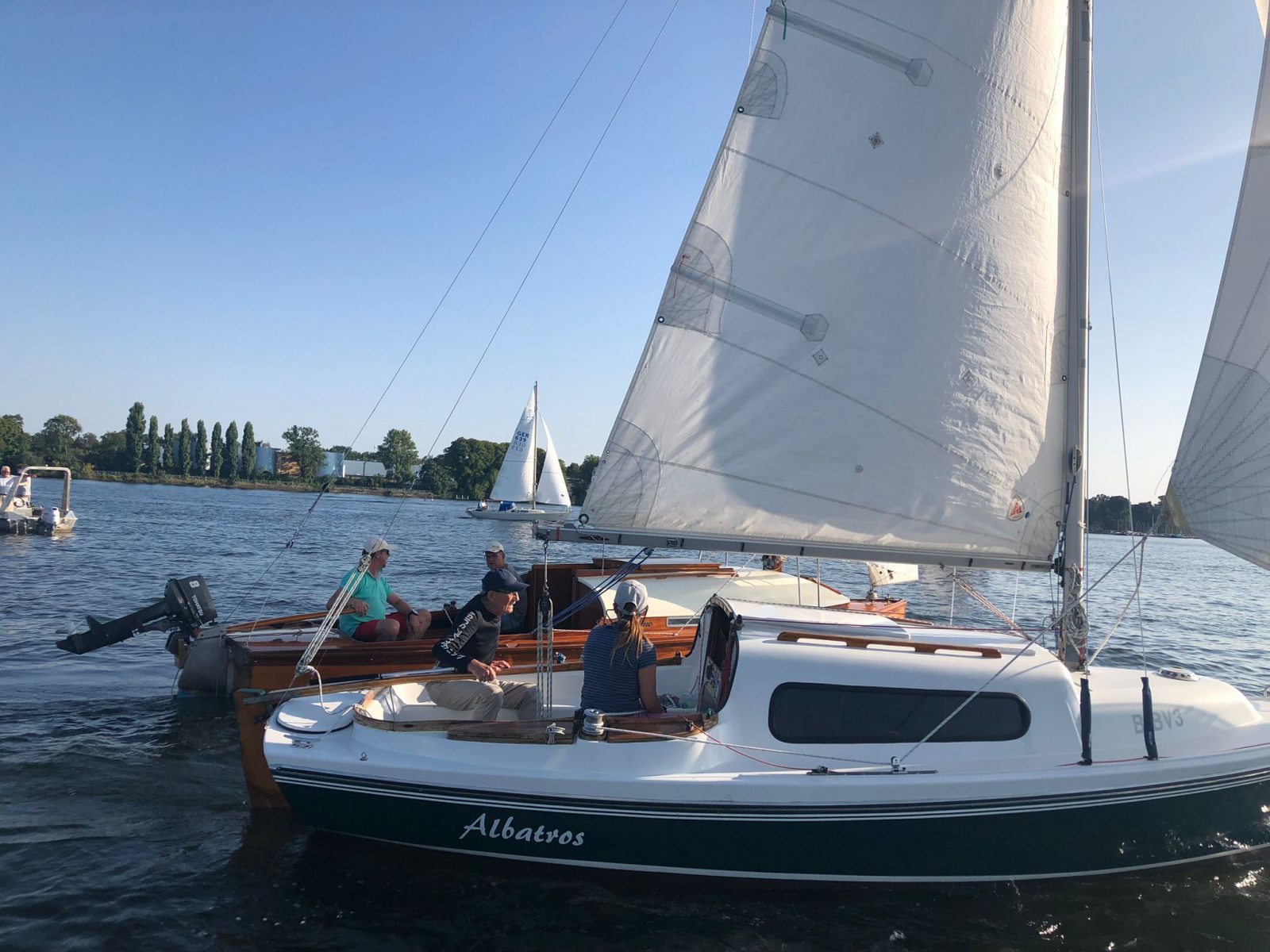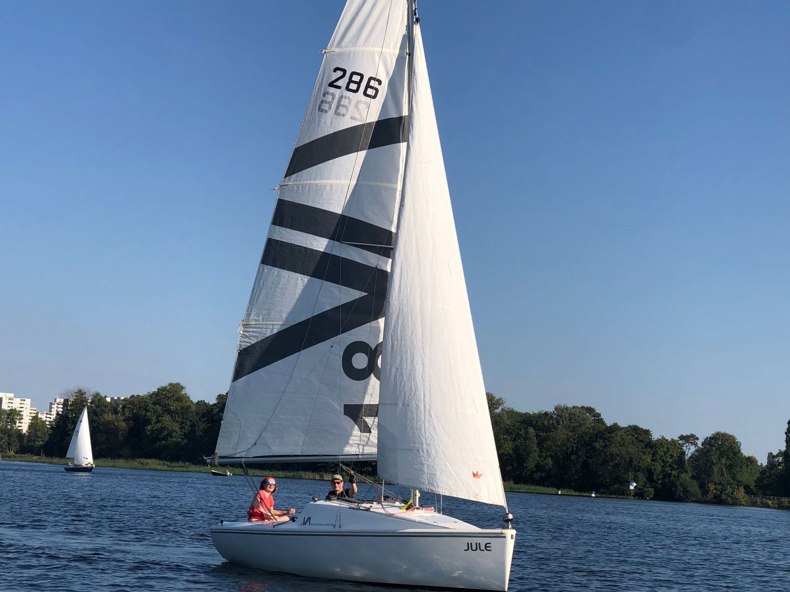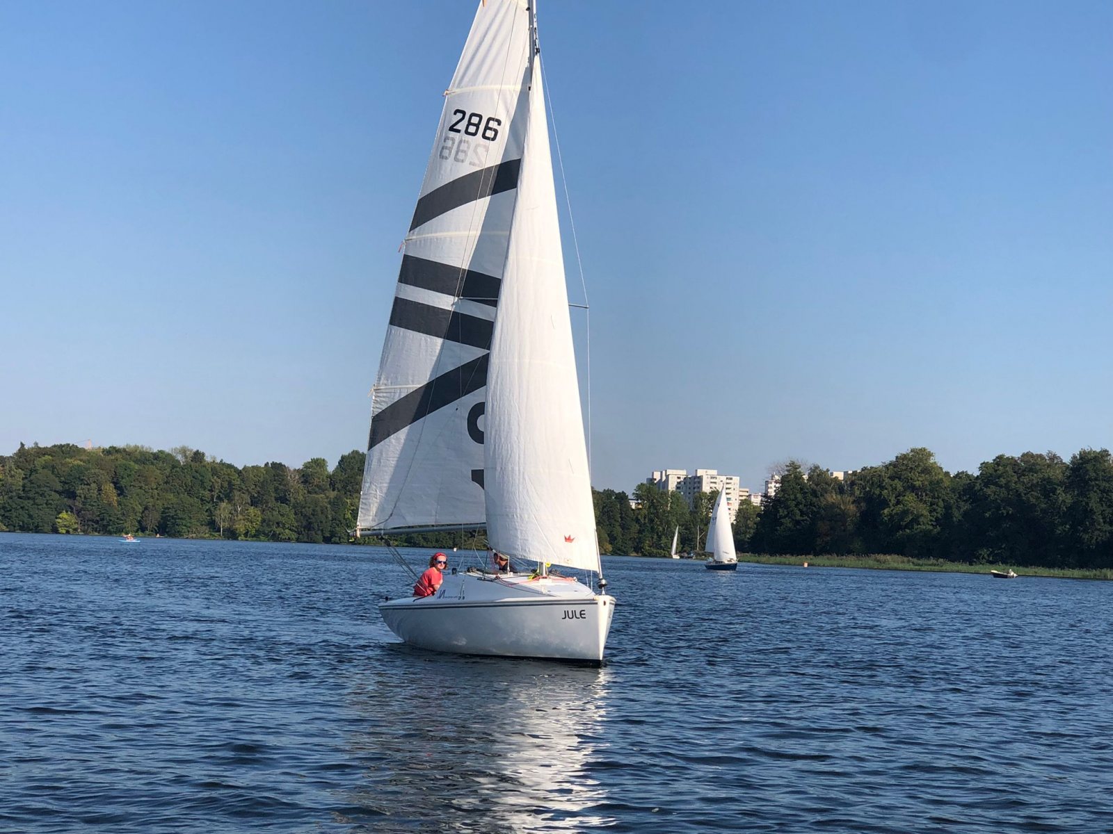 Bis kurz vor der Wettfahrt wurden bei sommerlichen 30 Grad schon mal einige erhitzte Gemüter im gut 22 Grad warmen See abgekühlt. In der Zwischenzeit legten Gerald und sein Team den Kurs für den leichten S-SO Wind fest: Start etwa Mitte des Sees, zunächst eine kurze Kreuz Richtung Verein, dann zurück bis kurz vor Lindwerder, von dort wieder Richtung Verein zum Ziel. Vor dem Verein und vor Lindwerder wurden die Wendemarken (=dortige Belüftungstonnen) dazu mit zusätzlichen gelben Markierungen kenntlich gemacht. Rasmus gestaltete den Wind recht variantenreich, und bei der kurzen Strecke war der Start natürlich sehr wichtig. Pünktlich um 17:01 kam das Startsignal für die 11 Boote.Die Nerven lagen in Zweikämpfen mit teils legendärem Potential vielfach blank. Nico und Timo testeten eine völlig neue Taktik: Sie sparten sich den hektischen Start komplett und fuhren erst etwas später in Ruhe los, um kurz darauf überraschend mit ihrer Rennmaschine in Rauschefahrt unter Spi in der Spitzengruppe aufzutauchen. Das Feld war relativ dicht beisammen, und es wurde bis zum letzten Meter um die Positionen gekämpft. Nach etwa 35 Minuten war der Spaß dann leider schon vorbei. An Land erwartete bereits die Crew der Vergnügungskommission die Athleten, und nach einer neuerlichen kommunikativen Erfrischung im See gab es Wraps zum Selberbauen. Bei der Bekanntgabe der Platzierungen lagen erneut die Nerven blank, diesmal gleich doppelt, denn durch ein ausgefuchstes, derzeit noch nicht abschließend zu durchschauendes Verfahren wird erst im Nachhinein festgelegt, welche Platzierung einen Bericht über die Wettfahrt verfassen darf…