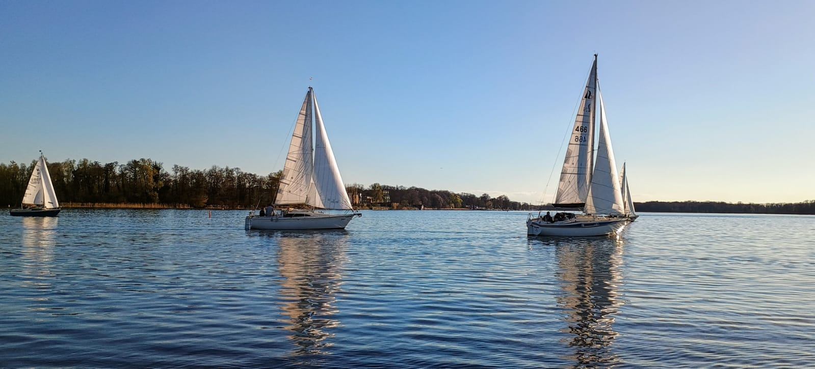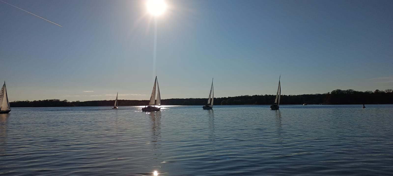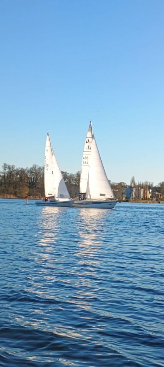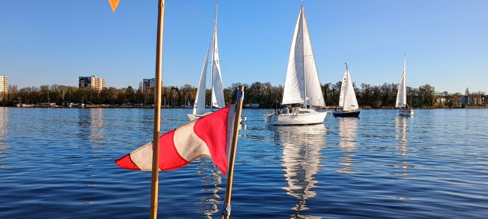Kaum ist der Winter vorbei, da fand schon vor dem offiziellen Ansegeln unsere erste vereinsinterne Wettfahrt statt. Mit fünf Booten sind wir am 4. April bei angenehmen Temperaturen, strahlendem Sonnenschein und relativ konstantem Wind zwischen einer und zwei Beaufort auf den See hinausgefahren. Um 17.30 sollte der Start sein – eigentlich, denn offenbar hatten nicht nur die Segler, sondern auch der Wind seine Uhr synchronisiert und pünktlich zum Start zeigte der Windmesser 0 kts Wind an. Nach einer kurzen Startverschiebung von zwei Minuten konnten wir den zweiten Anlauf erfolgreich nutzen – und dieses Mal tatsächlich starten.