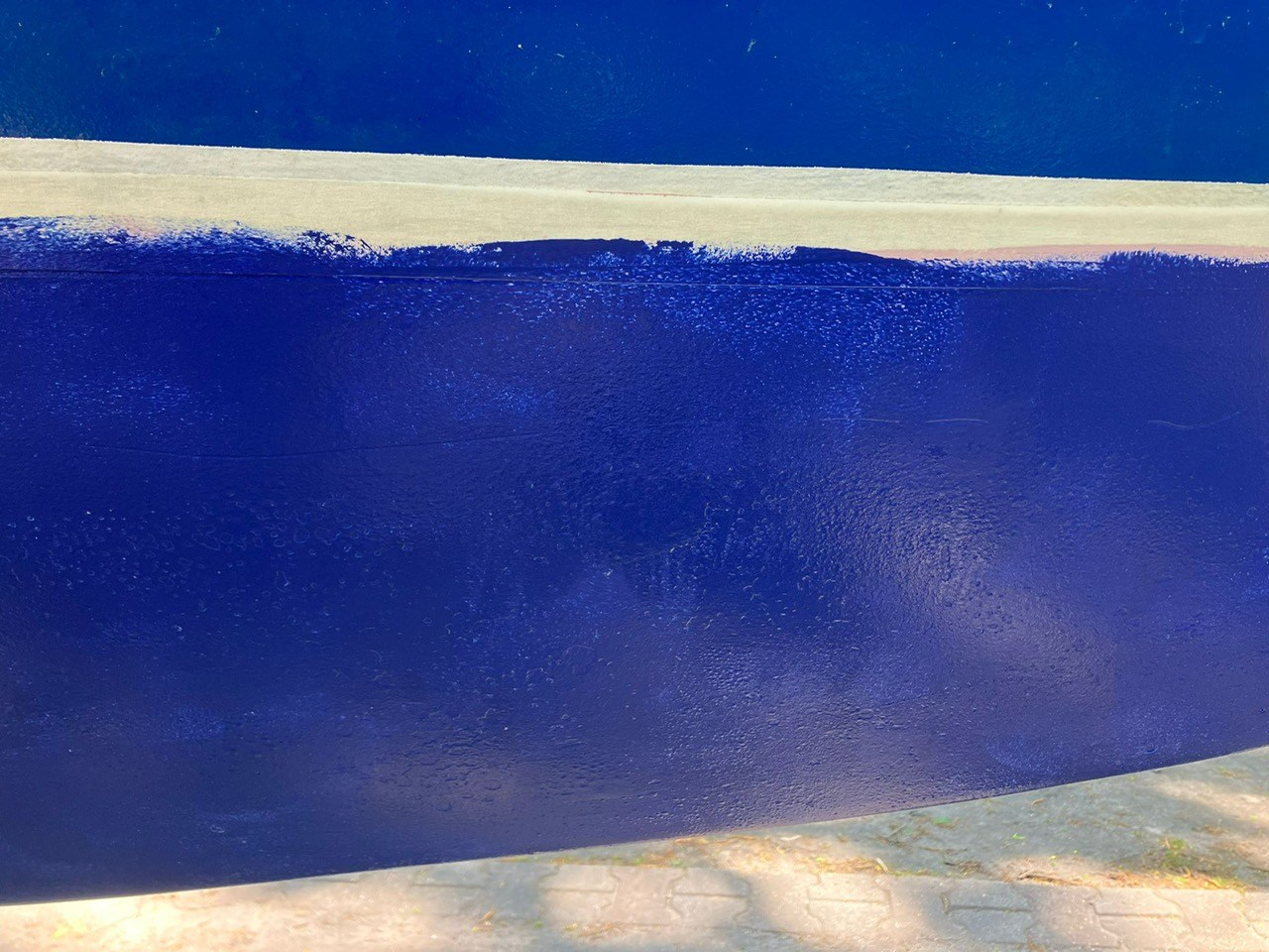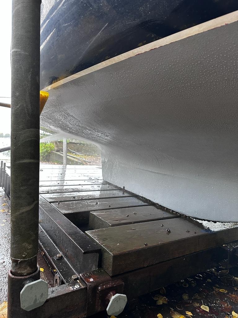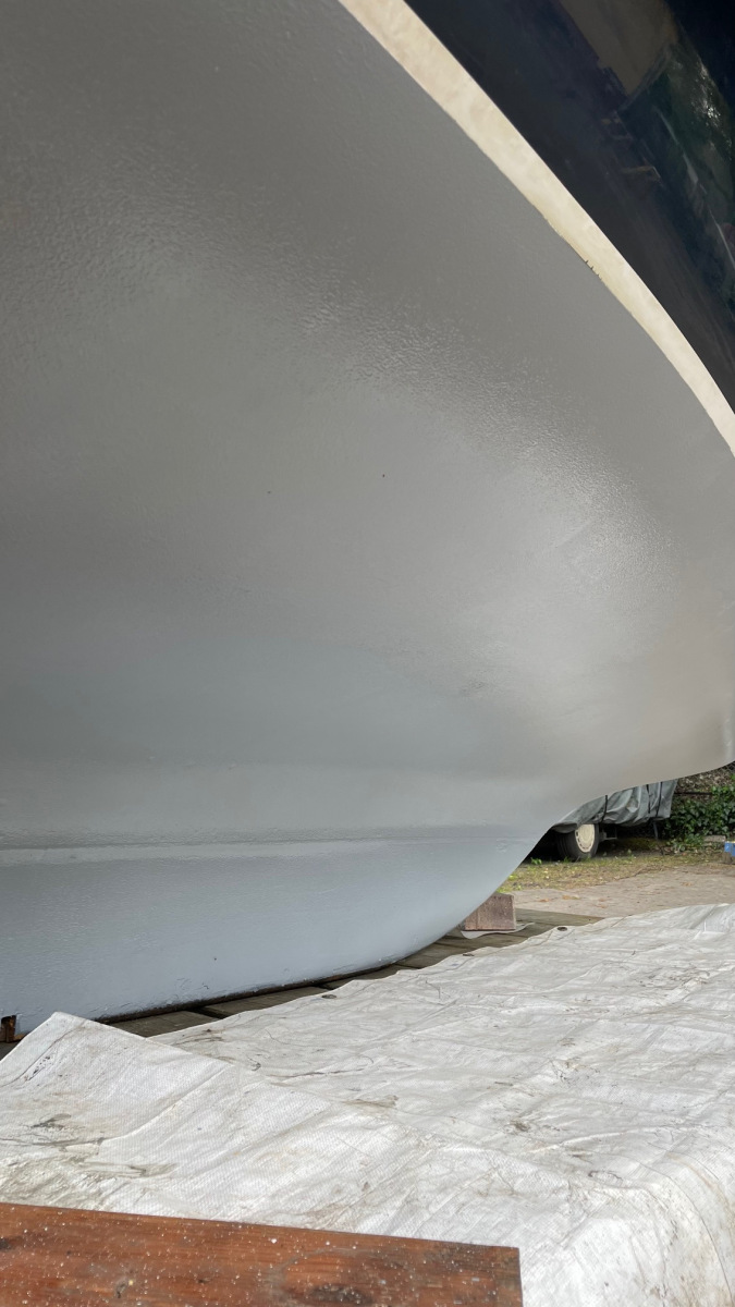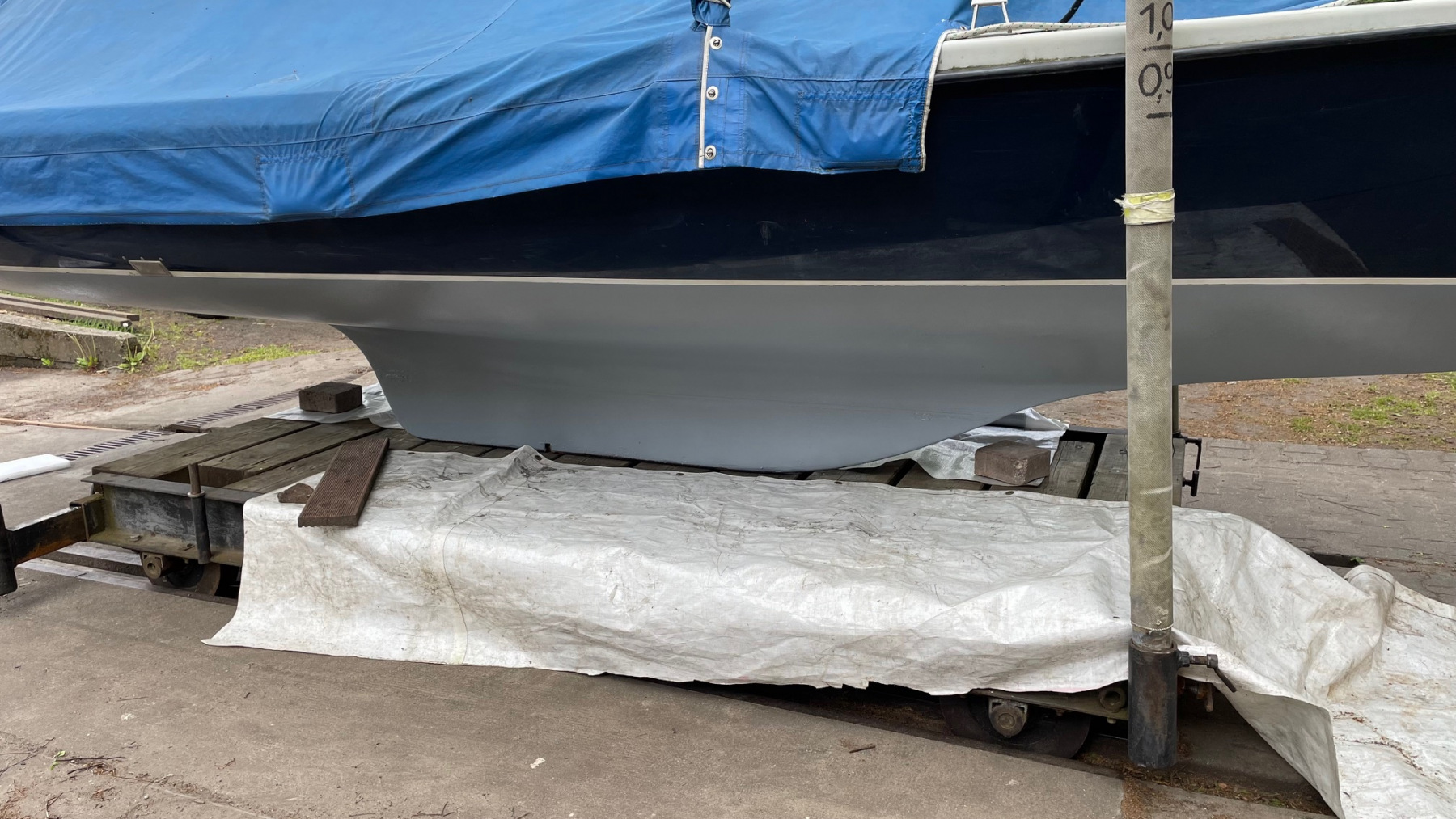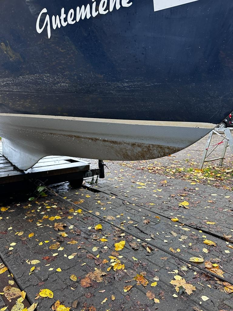 • Das „Probierpaket Hempaspeed TF“, bestehend aus 2K Conversion Primer und Hempaspeed TF, wurde nach abwaschen des Rumpfes mit einem Schleifvlies innerhalb von 2Tagen aufgebracht. Die Materialmenge war eigentlich zu wenig für ein ganzes Boot, die Schichtstärke konnte nicht erreicht werden. Bis zum Slip-Vorbereitungs-AD am 04.11.2023 wurde das Unterwasserschiff nicht mehr betrachtet.