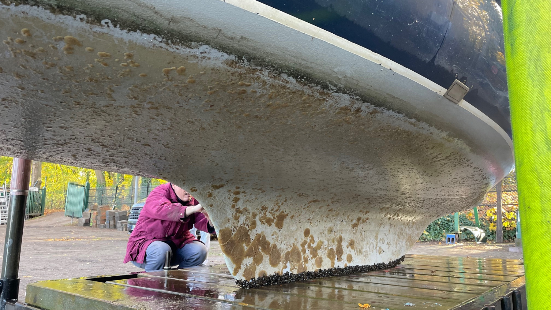 • 04.11.2023 Das Ergebnis war super, keine groben Anhaftungen, der „Algenschleim“ ging mühelos mit einer Waschbürste ab. Muschelanhaftungen waren eigentlich nicht gegeben.