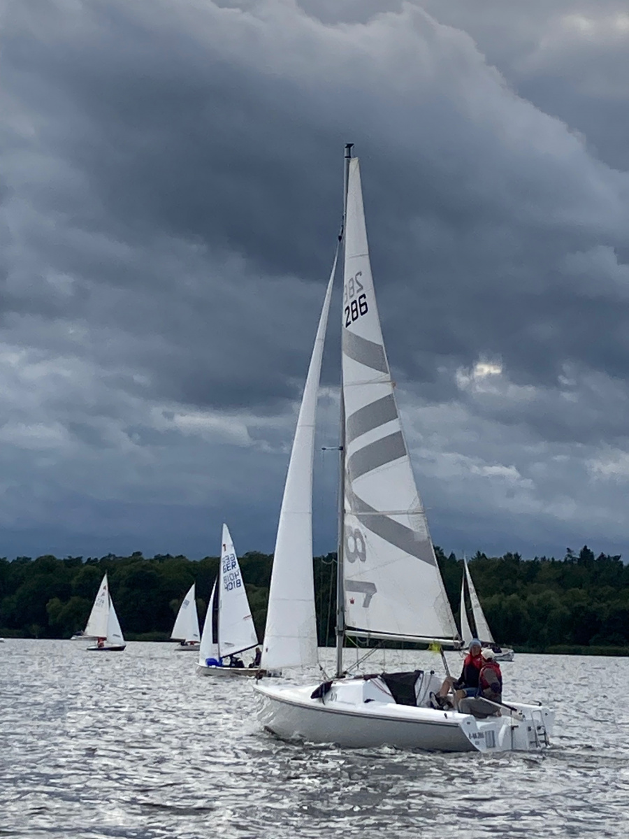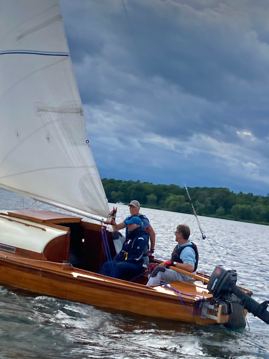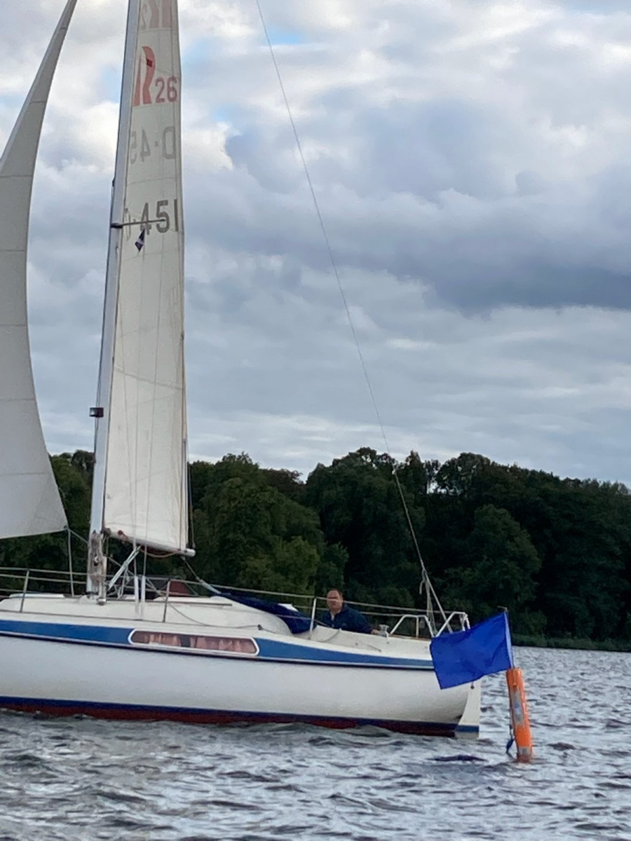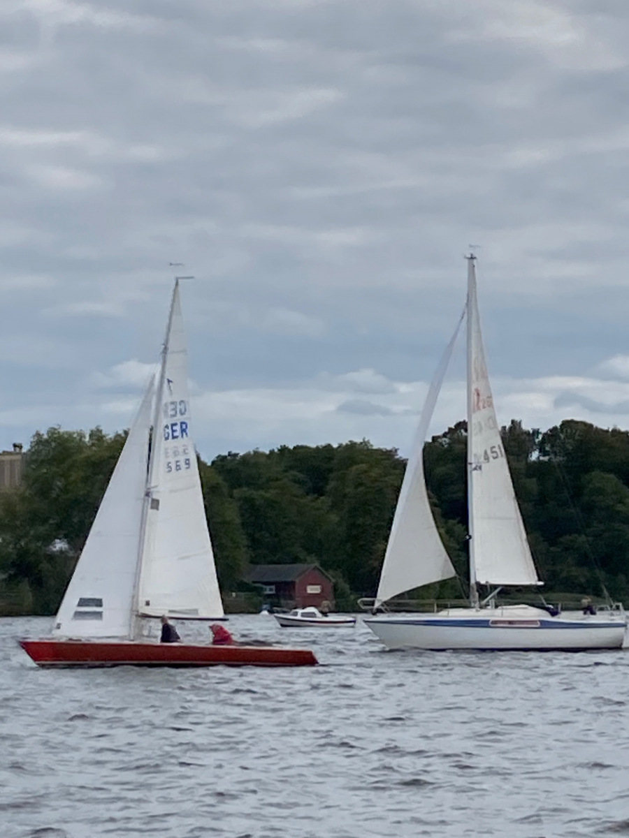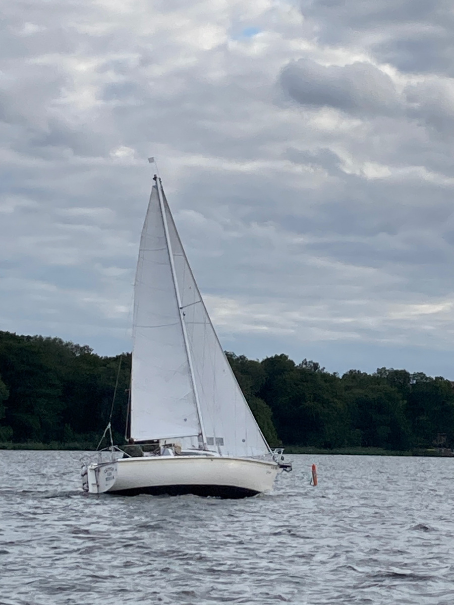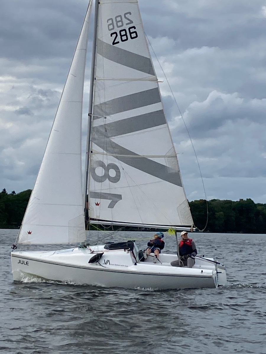 Es ist viel Wind und die Jule möchte diesmal gerne auch an der Wettfahrt teilnehmen. Ohne Motor und ohne Reff versuchen wir es. Vor dem Start und auf dem See sahen wir das Malheur: Ein Mastrutscher war ausgehakt. Da hilft nur ein Aufschiesser und das Großsegel neu justieren. Puh gerade noch geschafft. Gleich geht’s los. Ein unglaublich toller Kurs.