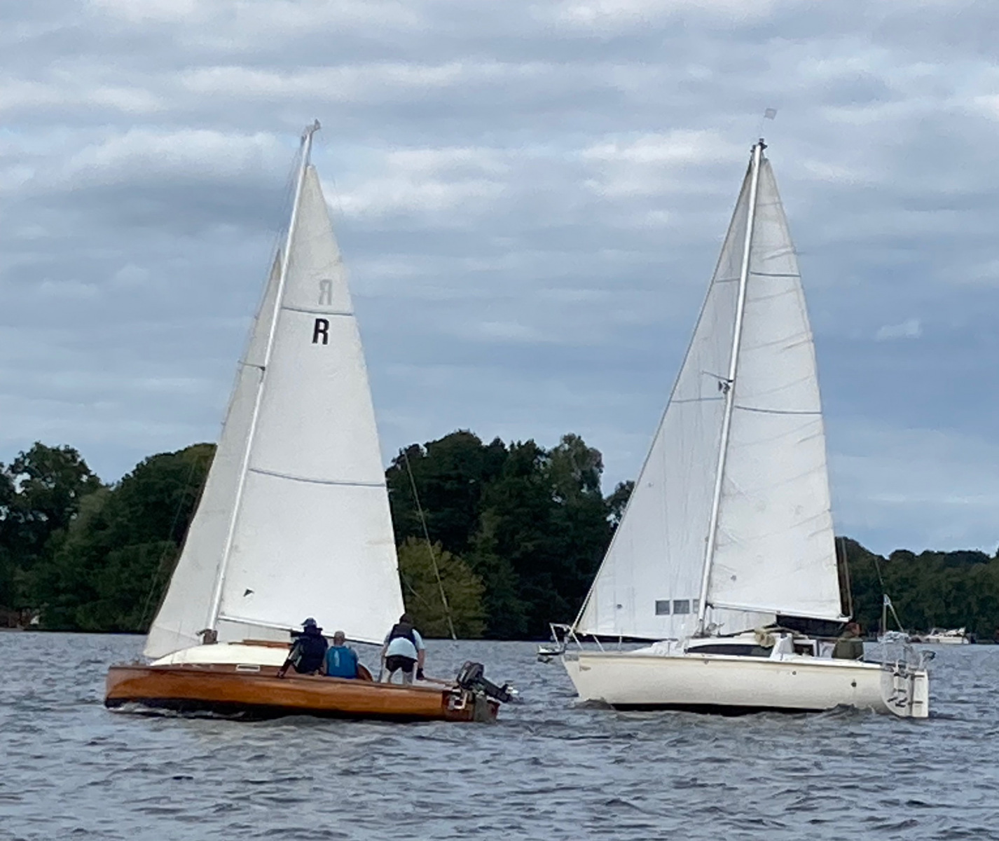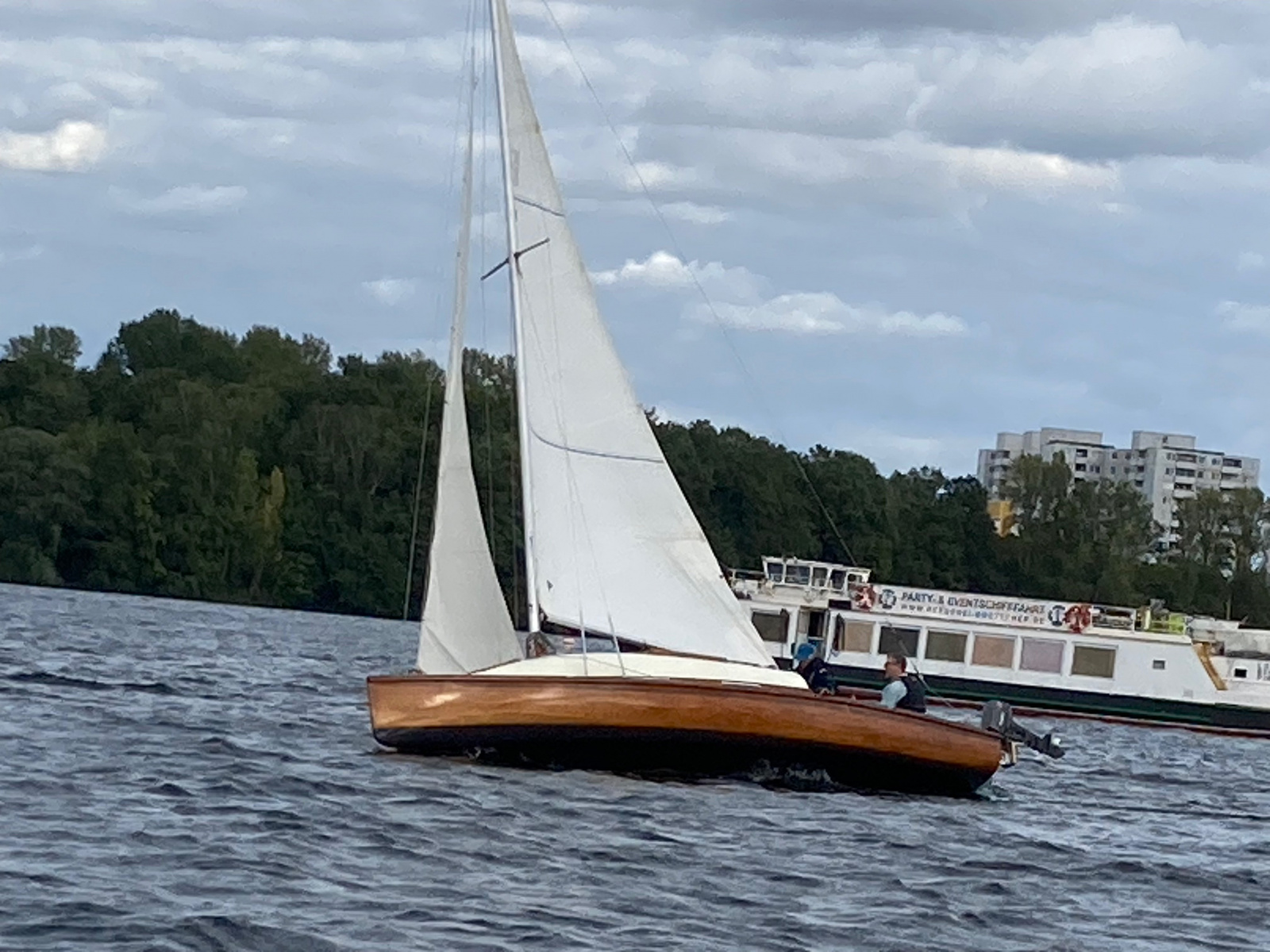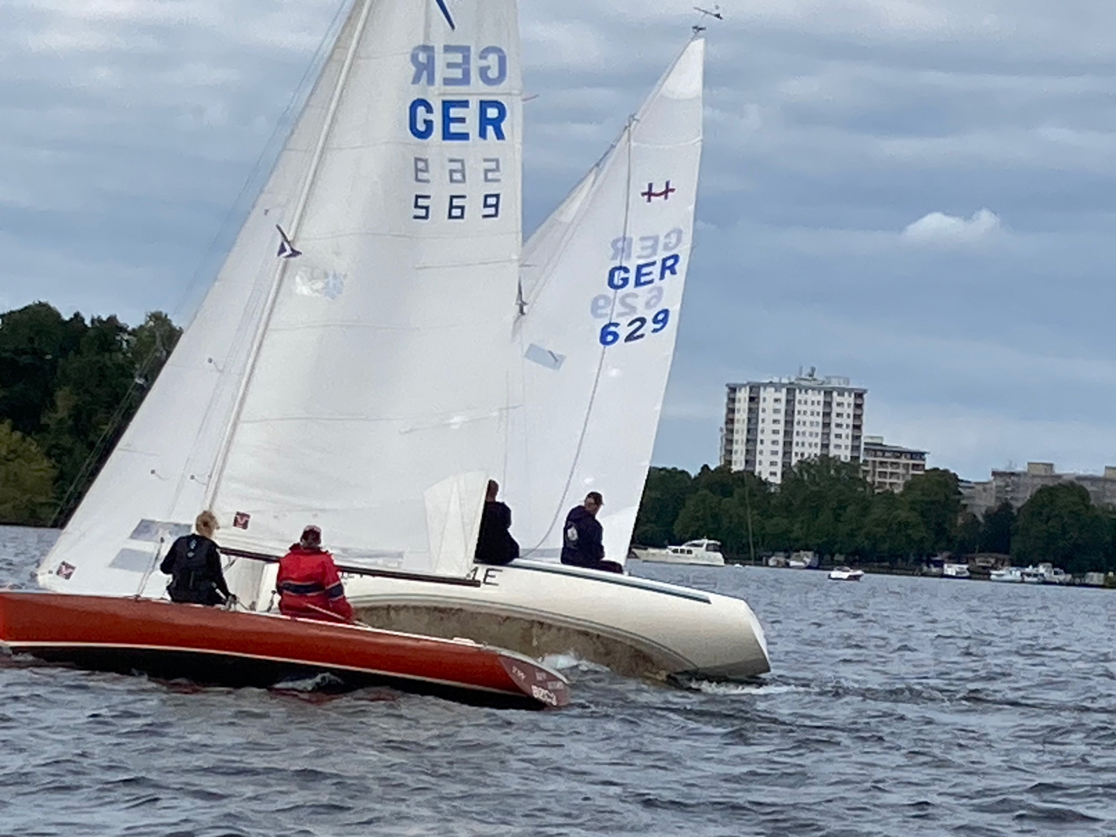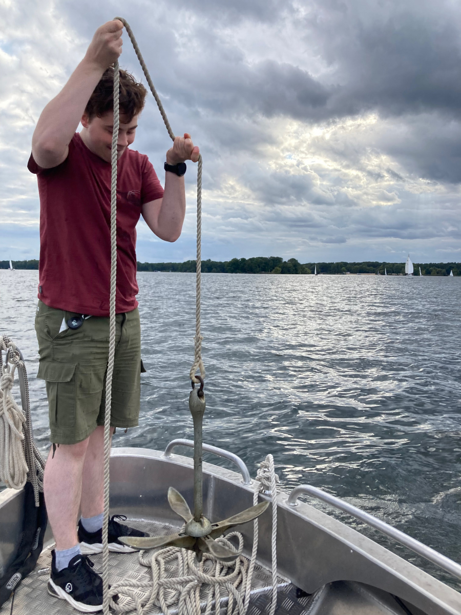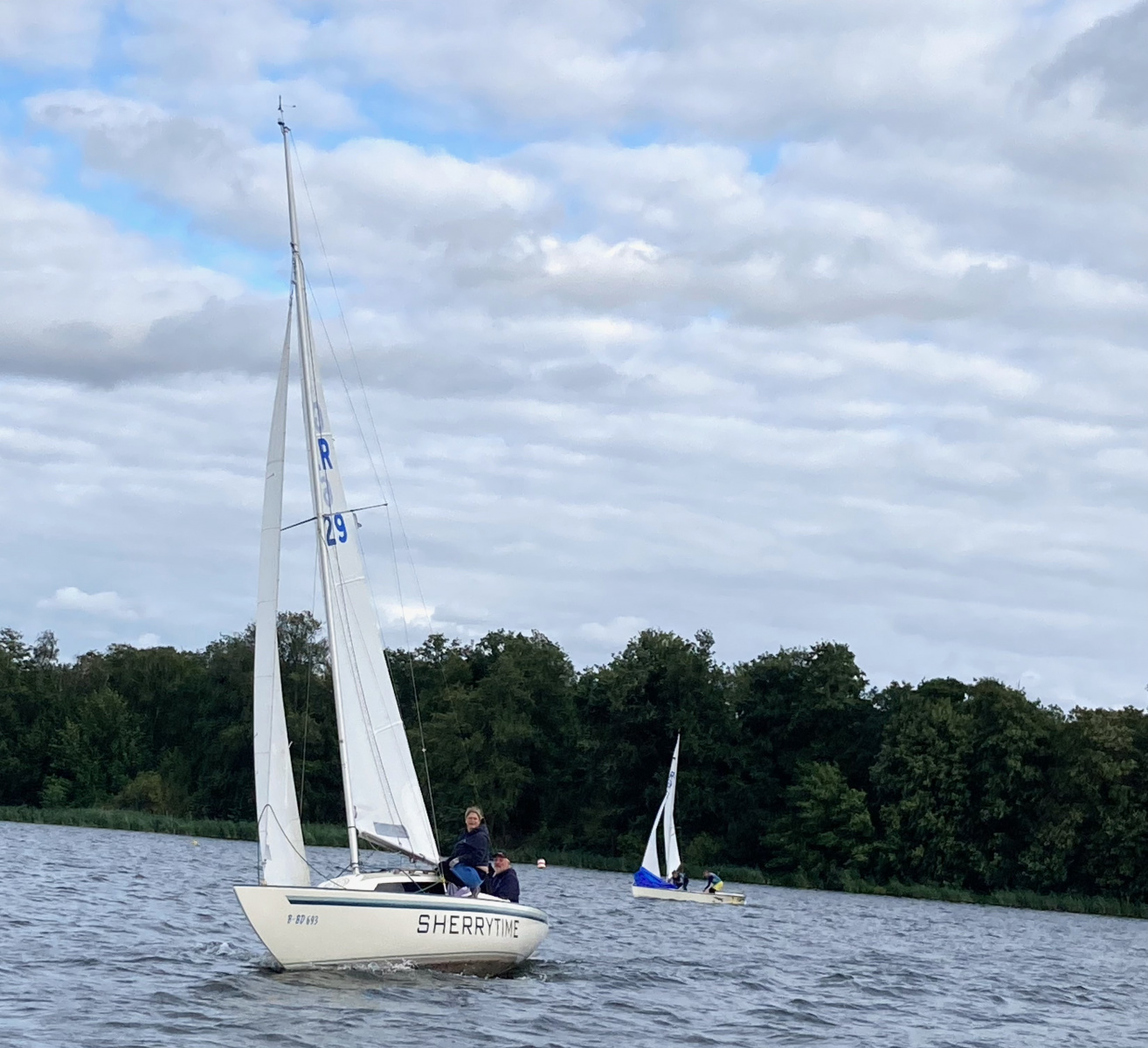 Es ist viel Wind und die Jule möchte diesmal gerne auch an der Wettfahrt teilnehmen. Ohne Motor und ohne Reff versuchen wir es. Vor dem Start und auf dem See sahen wir das Malheur: Ein Mastrutscher war ausgehakt. Da hilft nur ein Aufschiesser und das Großsegel neu justieren. Puh gerade noch geschafft. Gleich geht’s los. Ein unglaublich toller Kurs.
