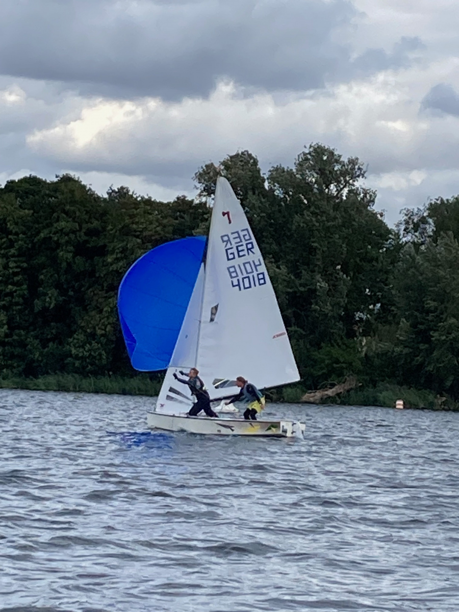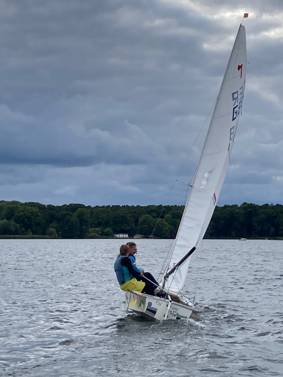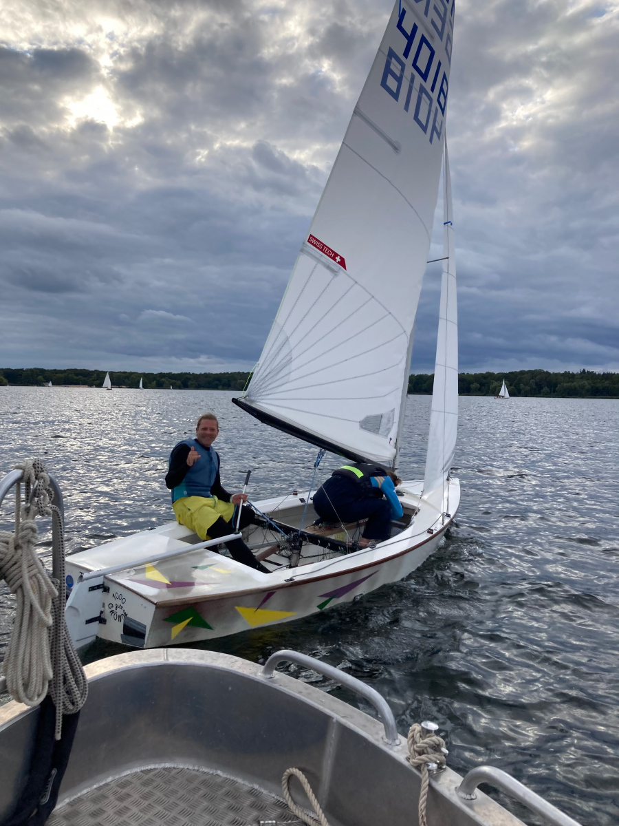 Das Wetter zeigt Wolken, der See ist etwas rau. Die 6. Vereinsinterne startet. Schöner Kurs, dreimal hoch zur Bezirkstonne am Strandbad und dreimal zurück – Up and Down Kurs. Der Wind weht aus West, so hin eine Kreuz und zurück kam es achterlich und das Gefühl der Wind schläft ein. Gerald mit seiner O-Jolle hatte Probleme mit dem Segel und zog wieder in den Hafen zurück. Leider.